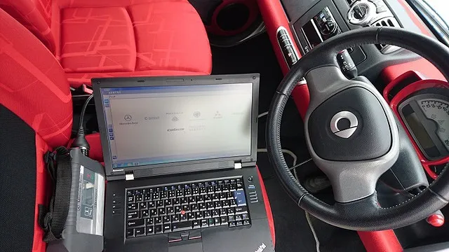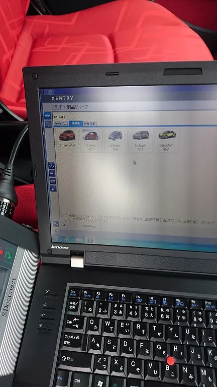 メルセデス・スマート専用診断機にて点検、クラッチミートなど初期化等も行います。