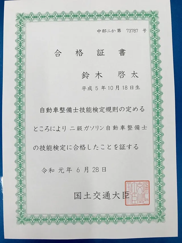 鈴木啓太君がこの度、「2級ガソリン自動車整備士」の資格を取得しました。パチパチパチ!
