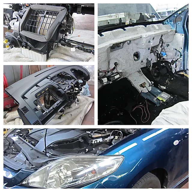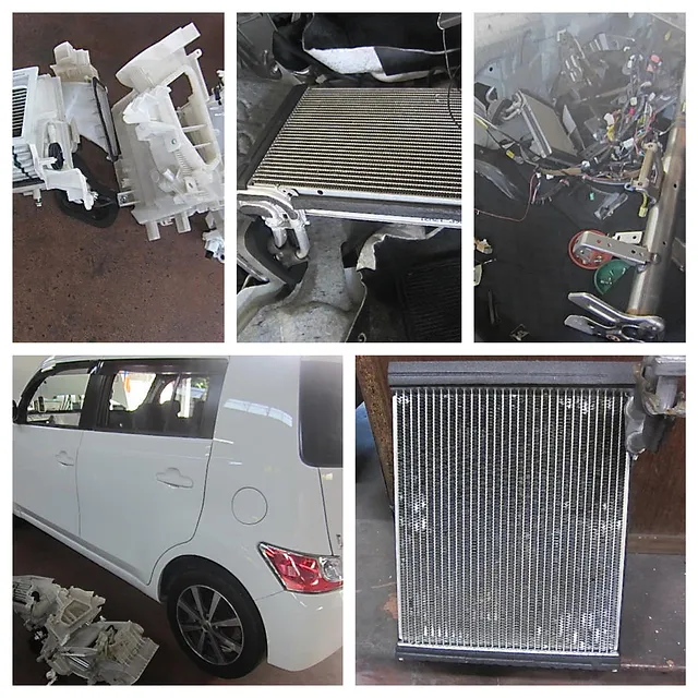 このところ「エアコン修理」が増えてきています。今年の異常な暑さのせいでしょうか?車のエアコンも悲鳴を上げているようです。今回のbBは「エバボレーター」に穴が開いてそこからエアコンガスが漏れているという症状でした。交換はかなり手間で、フロントダッシュボードを外さないと交換できないようです。暑い中、部品も届き無事交換終了です。
