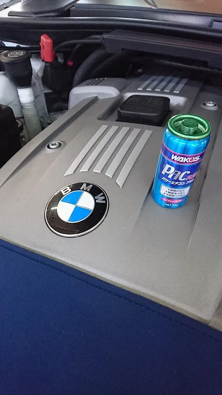 BMW330iのオーナー様にご来店、メンテのご希望のお話をお伺いしながらワコーズのエアコン添加剤の充填のご依頼が有りましたの施工させて頂きました。