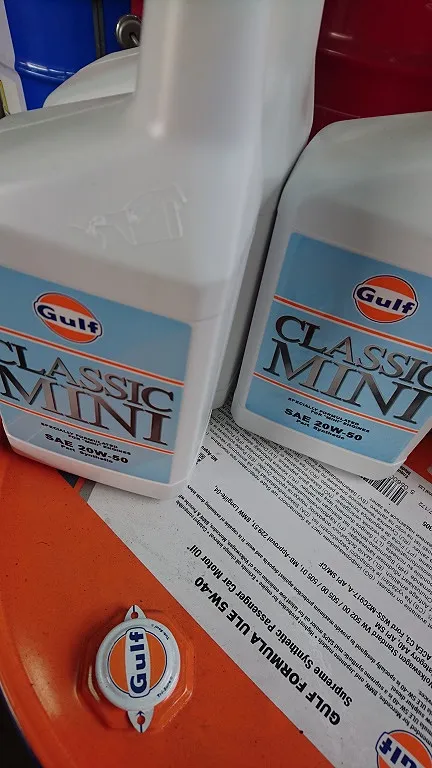 今回の使用オイルはガルフ社から出ているクラッシクミニ専用オイル(20W50)を使います。