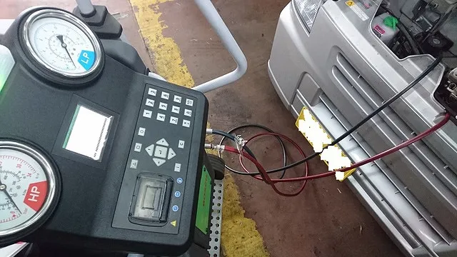 ボッシュエアコンチャージ&クリーニングテスターにてフロンガス回収、洗浄、規定量をエアコン機関を真空引き後、再充填致します。