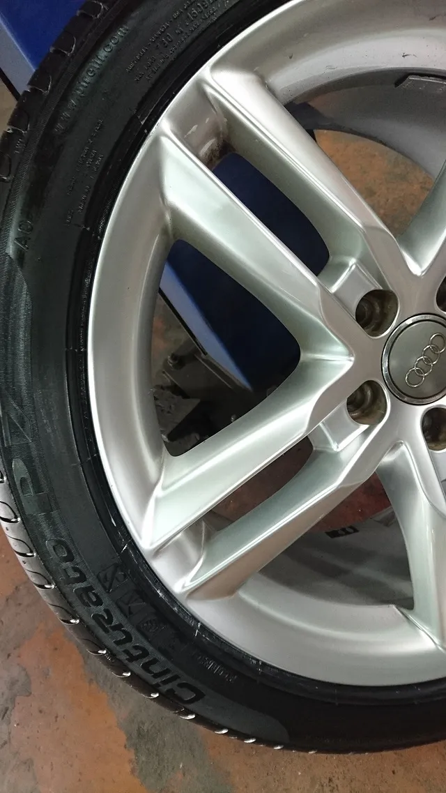 お持ち込みいただいたタイヤを組み替え、バランス調整も行い、ブレーキダストで汚れたホイールもでき得る限り綺麗にいたしまして組付けます。