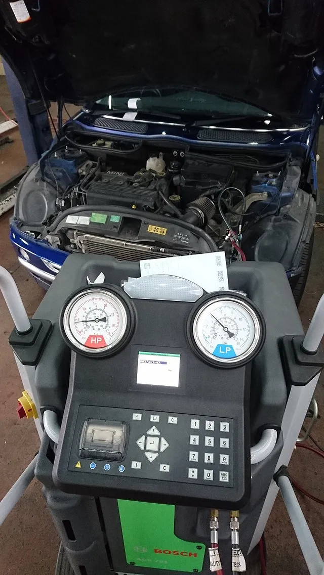 半田市 BMW-MINI エアコン効かず、修理 ACコンプレッサー他修理&ボッシュエアコンクリーニング&ガス充填。 Bosch Car Service 巽自動車