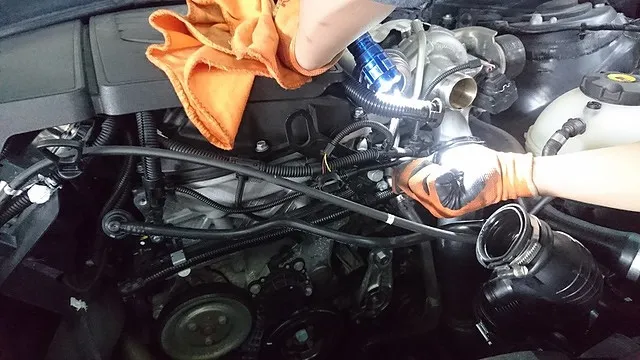 加圧テストを加え、漏れ箇所を確認しますとタービン下のバイパスホース周りが怪しそうです・・