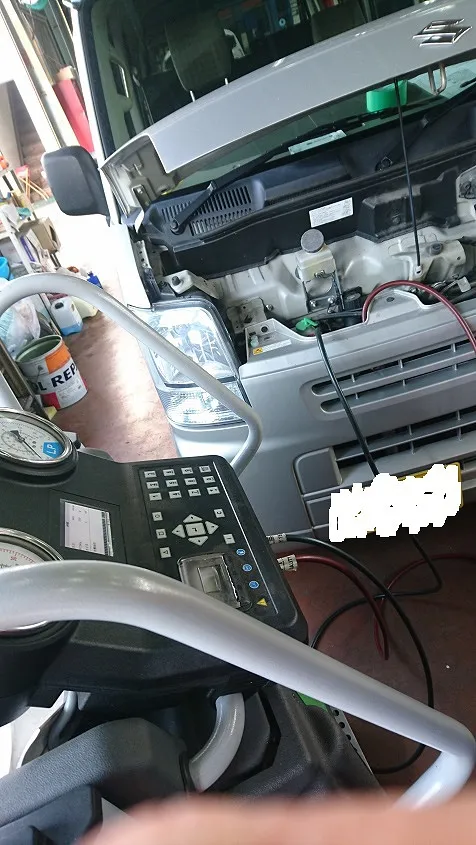 御業者様からの点検整備のご依頼で販売されたお車の点検整備合わせてエアコンの効きが芳しくありませんでしたのでガス充填メンテ作業を行いました。