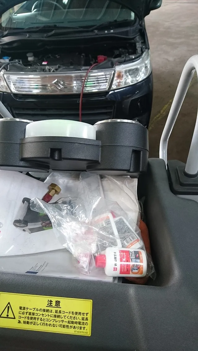 同時に潤滑のコンプレッサーオイルもそのお車に合わせて適量を充填させて頂いております。