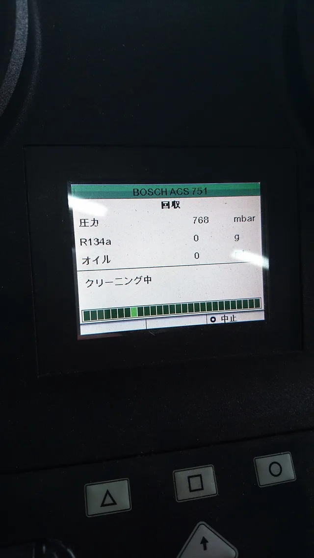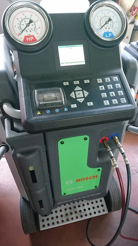 いつものようにボッシュ・ACS751 エアコンクリーニング、メンテンス機器を用いてクリーニングから適正フロンガス量をきちんと充填しなおします。