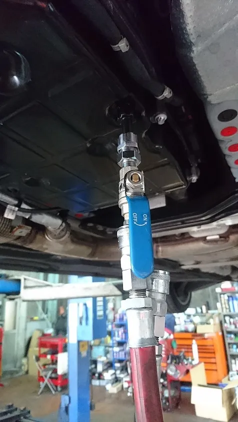 専用SSTを用いてMB規格対応の超低粘度ミッションフルードを充填してゆきます。