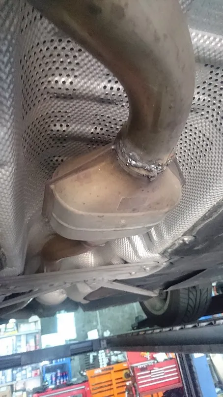 車両下回りを確認しました所、エキゾーストパイプが割れ中間ステーに干渉し、異音発生しております。