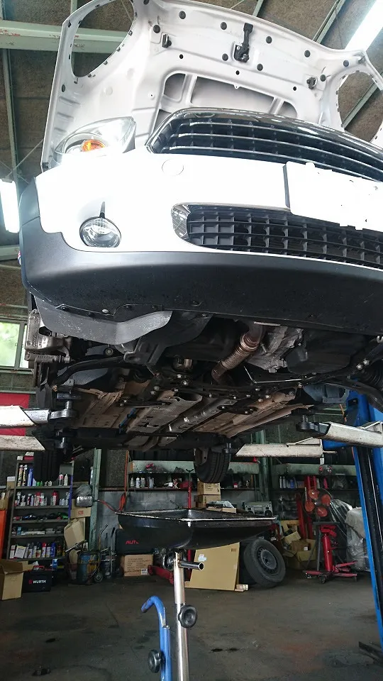 メルセデス・ベンツE55AMG(W211)EXマニ割れ、エンジンマウントなど交換やAT漏れ、ストレナー詰まり、交換やATF交換作業へ。
