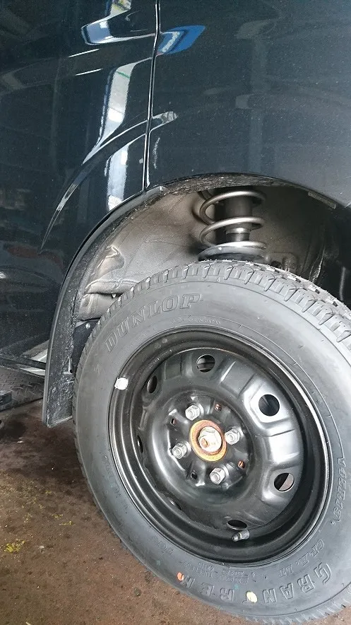 一連の作業が終わり、車重をかけ、今一度、増し締めを行い、タイヤの開き具合など点検調整致します。