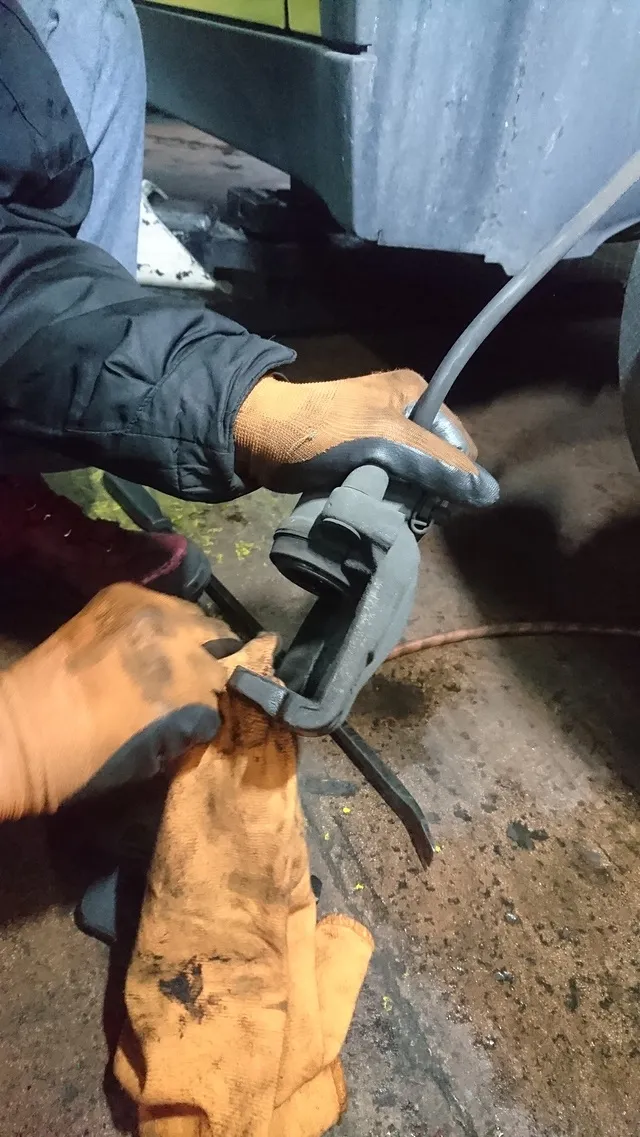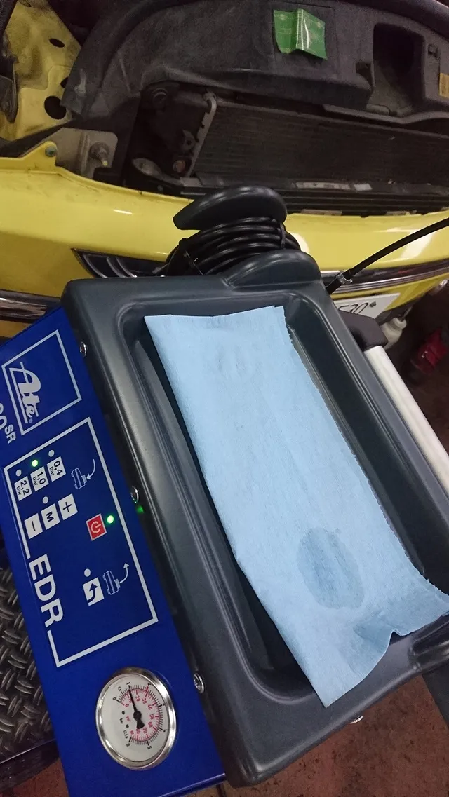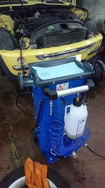 輸入車専用のブレーキフルード圧送アタッチメントと取付、規定圧力にて圧送、ブレーキフルードを入れ替えます。