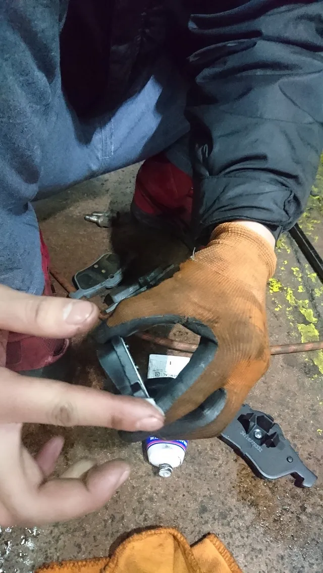 ブレーキキャリパーも清掃、ブレーキパッドのシムなど摺動部へのグリス散布も行います。