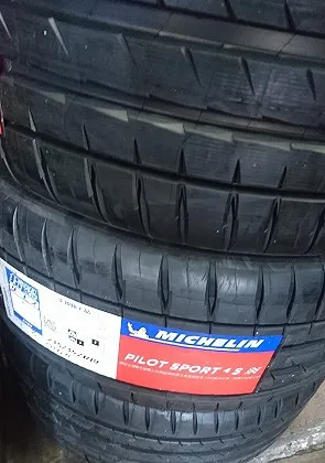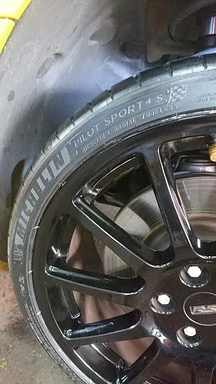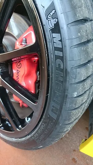 外装修理(板金、交換作業含み)を終え、エアコンガスクリーニング&充填やご依頼タイヤ(ミシュラン、パイロットスポーツ4)への交換作業です。