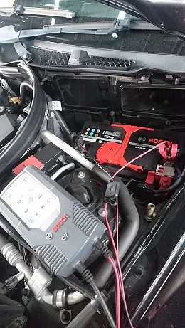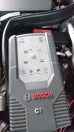 結果、充電指示となりましたのでボッシュ充電機器にて車載状態でバッテリーを痛めることなく充電作業を行います。