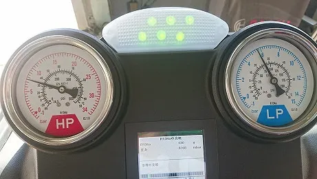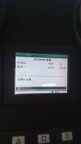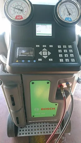 交換作業後にはいつものようにボッシュ製クリーニング&充填機器を用いて漏れのチェックやクリーニング、真空引きや適正量のフロンガスを機器を通じて行います。