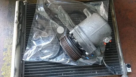 診断の結果、ACコンプレッサー、レシーバー付きコンデンサー、ACベルトなど交換させて頂きました。