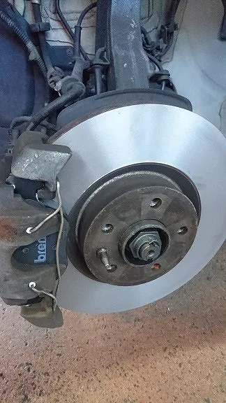 研磨されたディスクローターと新しいブレーキパッドを組み上げます。