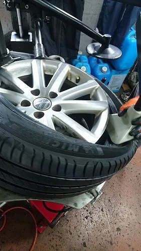 17インチサイズのタイヤですがミシュラン製タイヤはビート部などがしっかりしているためサポートを使いながら丁寧にタイヤの組み付けを行います。