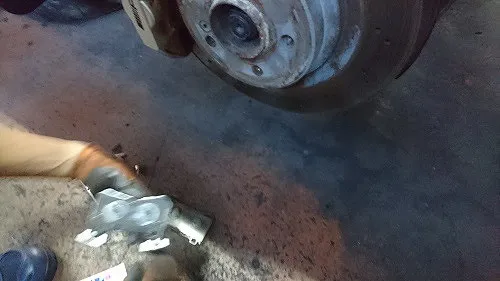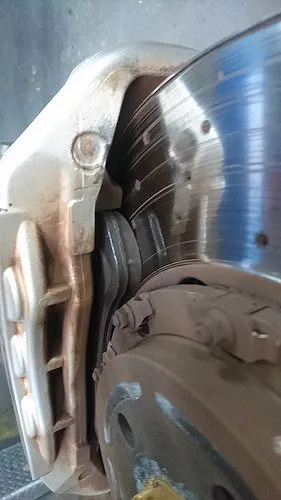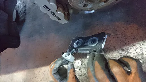 フロントはまだ十分パッド残圧がありましたがリアは交換時期の残の為、お客さんからは基本、お任せで今回の作業のご依頼頂いておりましたがリアパッド摩耗の為、交換の旨をご報告しまして交換作業を行います。