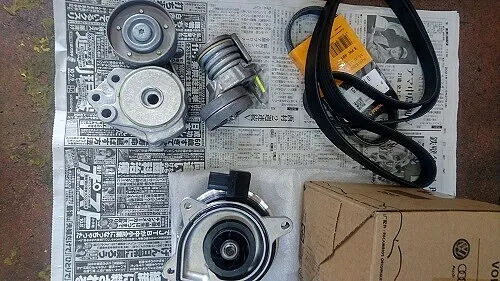 フォルクスワーゲン(VW)シャラーン 電動ウォーターポンプやファン(ドライブ)ベルト、テンショナーなどの交換作業です。