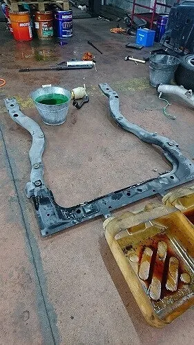 一緒に外したサブフレームは汚れやオイルしみなどスチーム洗浄&乾燥させ、防腐黒塗装を施しておきます。