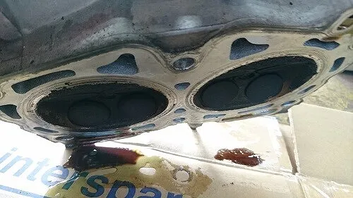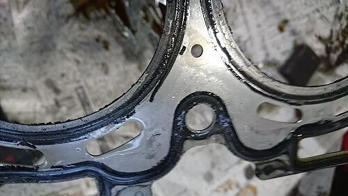 シリンダーヘッドを取り外し、その際のシンダーヘッドガスケットは確かに怪しい(冷却水抜け)箇所がありました。