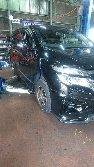 日産のエルグランドにて新品・お持ち込みの車庫調キット他の取付やアライメント点検調整の作業を行わせて頂きました。