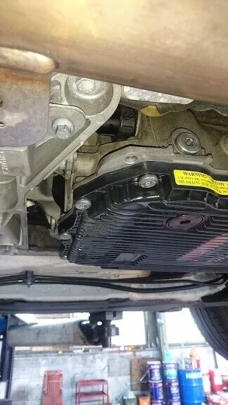 お車をリフトUPし確認のところ、画像の通りATオイルパン回りがオイル染みてベタベタな感じが出ています。
