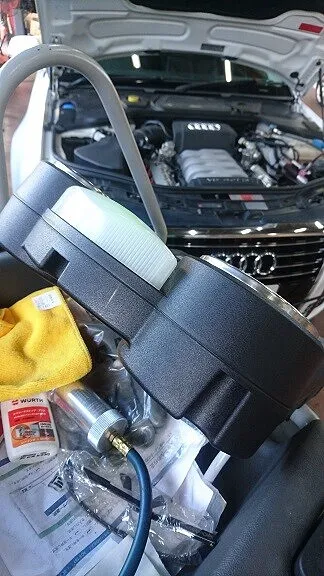 続きましてはエアコンの効きやフロンガスに不安があるとの事でスマート451とアウディA8にエアコンガスクリーニングを兼ねフロンガス量、AC機能診断チェック等を専用機器を用いて行いました。