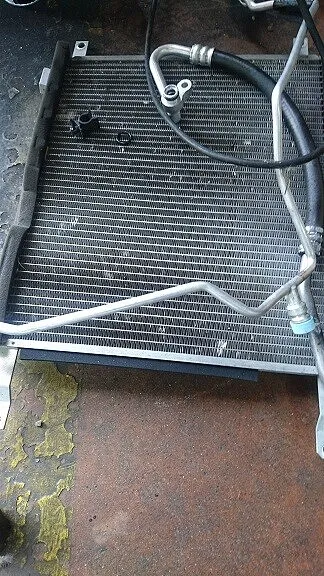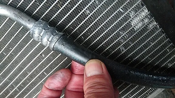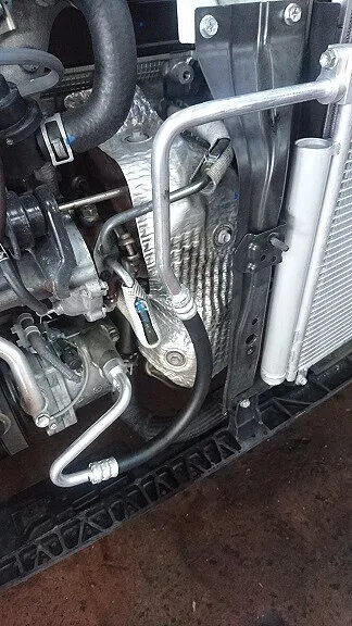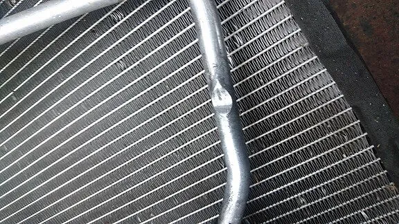 フロント回りをゴツンと当たっているとの事でしたがエアコンのコンデンサーは押されて反っております。それによりコンデンサーに取りつく高圧、低圧ホースにいたっては無理な角度での接続状態となっております。また、フロントバンパー裏に走るホース部カシメ部はうっすらと漏れ跡汚れらしきもの・・。パイプに至ってはサブフレーム部に干渉してへこみ、潰れが生じております。