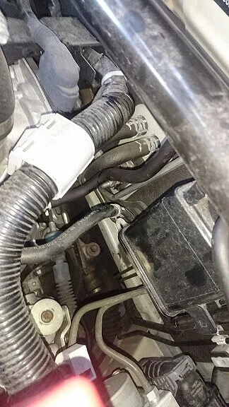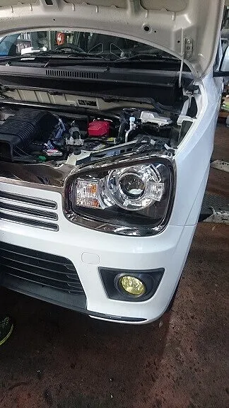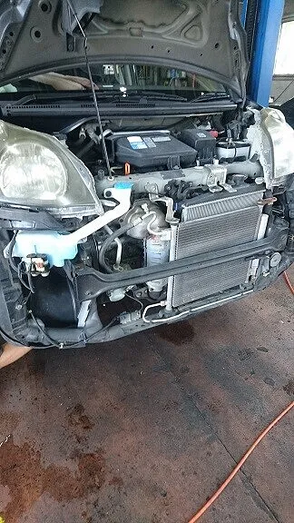 新品部品を加工、変形させるわけにはいかないので回りの取付位置を上手に調整しまして取付を行いました。配管接続も接続面に対して真っすぐな取付、もちろんOリングなどは新品へ交換です。作業の為、ヘッドランプ取り外しが生じましたので最後にはヘッドランプ調整も行います。