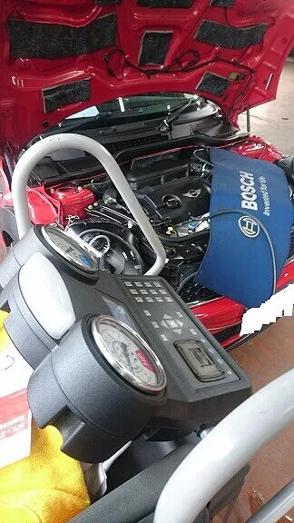 関連部品の交換作業、確認が完了しましたボッシュ製エアコンガスクリーニング&診断、充填機器に接続してお車に合わせたフロンガス量を適正にチャージを実行してまいります。
