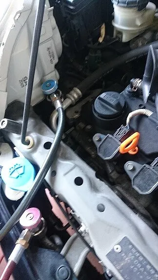 こちらのアルファロメオ・ミトもクリーニングを兼ね、きちんと決められたフロンガス量を充填いたします。事前に真空引きからの気密チェックなども実行済です。