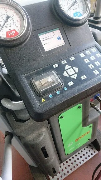 一連の交換作業が終わりましてボツシュ、専用カーエアコンクリーニング&フロンガスをお車に合わせて適正量をACコンプレッサーを稼働せずともきちんと充填を行います。
