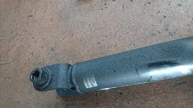 取外しましたところ、明らかにオイル漏れが生じ、アブソーバー本体がオイルまみれでございます。