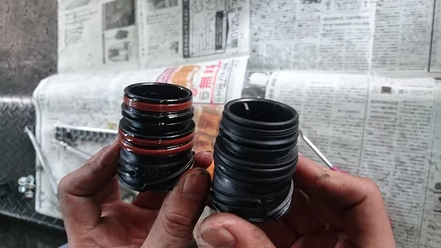 左:ATFがOリングを浸透し、コネクターソケット側へ浸み込み始めてるソケット・・