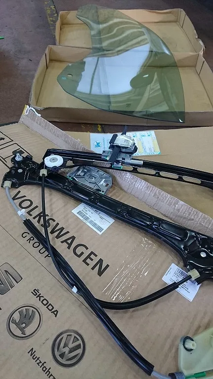 ドアガラス取り外し、新しいパワーウィンドウレギュレーターへ取替、ハードトップ型の為、完閉時のオートスライド位置を鑑み高さ調整を行いつつ、取付いたします。