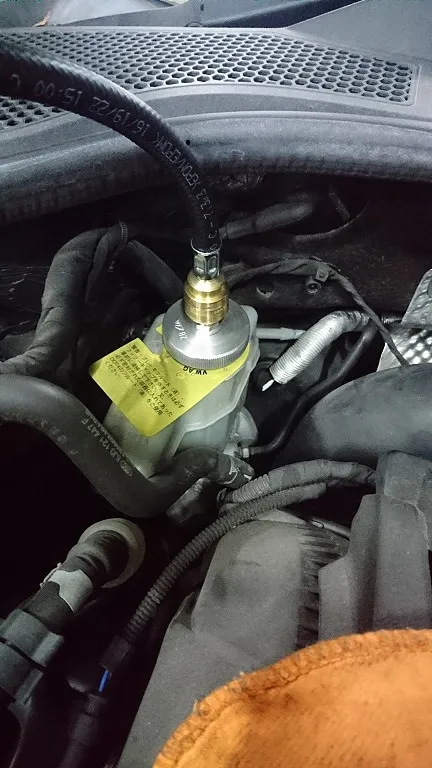 ブレーキフルード圧送入替機器に接続するためのアタッチメントを取り付けます。