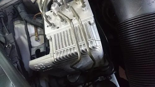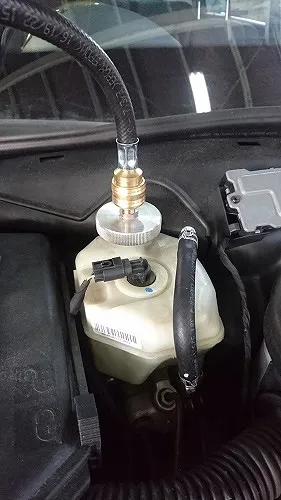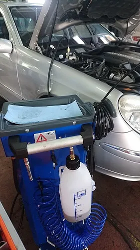 ブレーキフルード圧送入替機器によりウルト社のMBの為のブレーキフルードDOT4+(SBC対応)にて入替を行います。