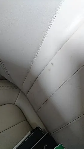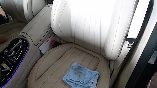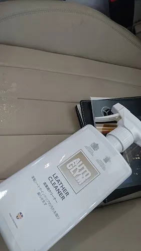 こちらのお車、ホワイトレザーシート使用でどうしても汚れが目立つため自動車レザーシートクリーナー(AUTOGLYM・英国)を用いてクリーニングを行わせて頂きました。