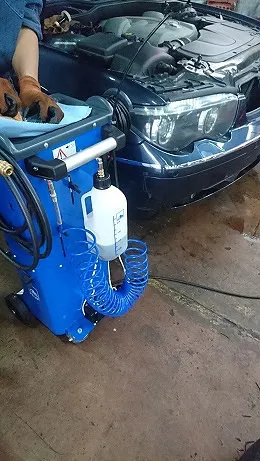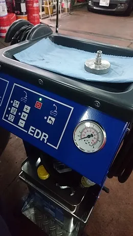 専用ブレーキフルード圧送入替機器を用いてブレーキフルードを綺麗なものへ入れ替えていきます。