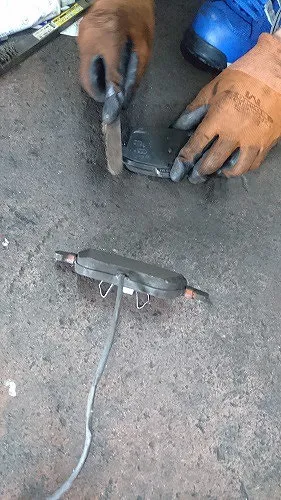 ブレーキフルード圧送機器より綺麗なフルードを充填させ、古いブレーキフルードを排出させてゆきます。