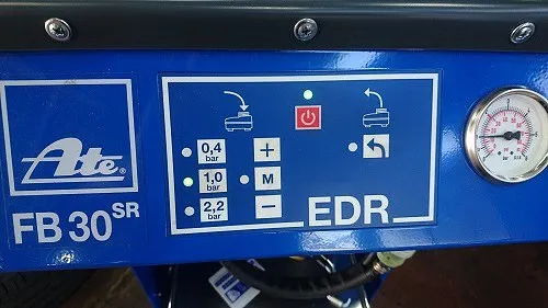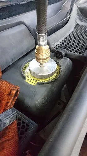 ブレーキの分解整備が終わりましたら自動車専用ブレーキフルード圧送機器を用いてブレーキフルードを入替を行います。