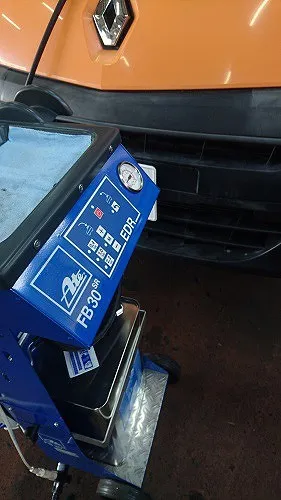 専用機器を用いて欧州DOT4規格のブレーキフルードの入替を行います。