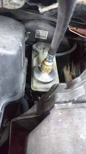 専用機器を用いて新しいブレーキフルードを圧送充填しまして古い劣化しましたフルードを排出して綺麗なフルードで満たしてあげるのです。