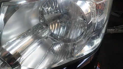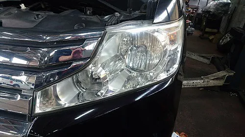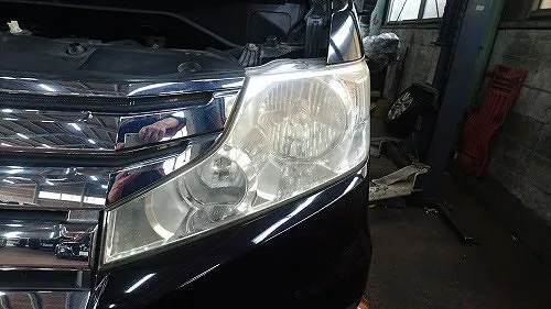 お客様からのご依頼はありませんでしたがご入庫時にヘッドランプ表面がかなり黄ばみ、くすみが出ており、これでは車検時の保安基準、ヘッドランプ光軸テストにも支障がでますので黄ばみ、くすみ除去を行います。(無料)