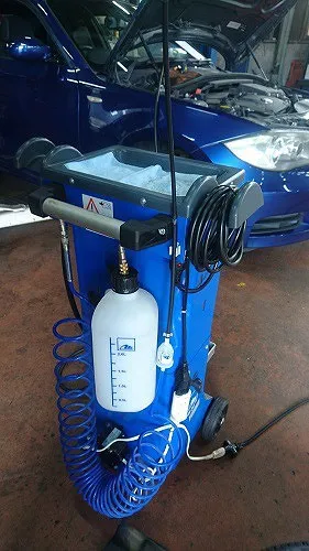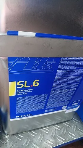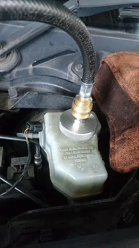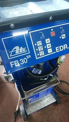 専用の圧送機器を用いてまた、BMW標準仕様のAte社(独)のブレーキフルードSL6(DOT4+相当)を使い新しく圧送入替を行います。
