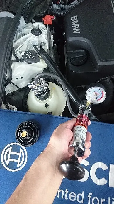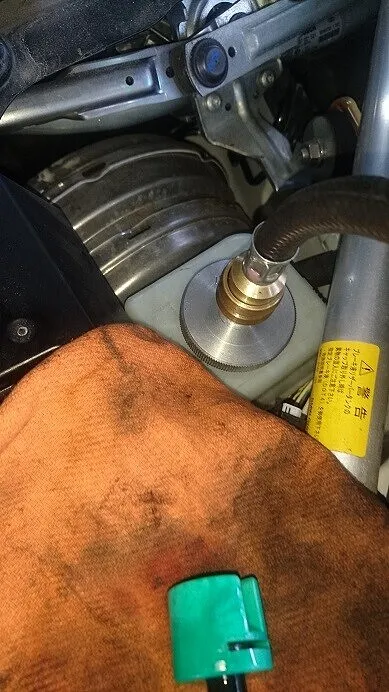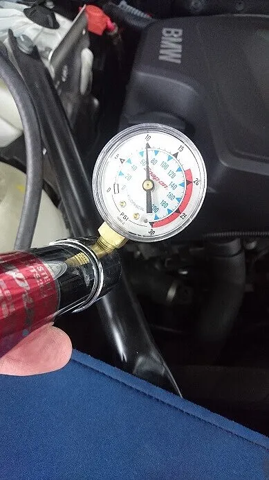 画像の通りアナログですが大事な点検、加圧をかけ、ラジエーターや配管等からの漏れをチェック。でもゲージの針の下がりはほぼ、見られません。